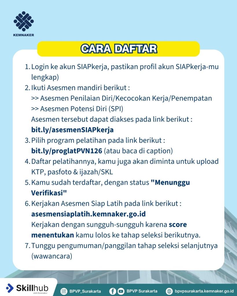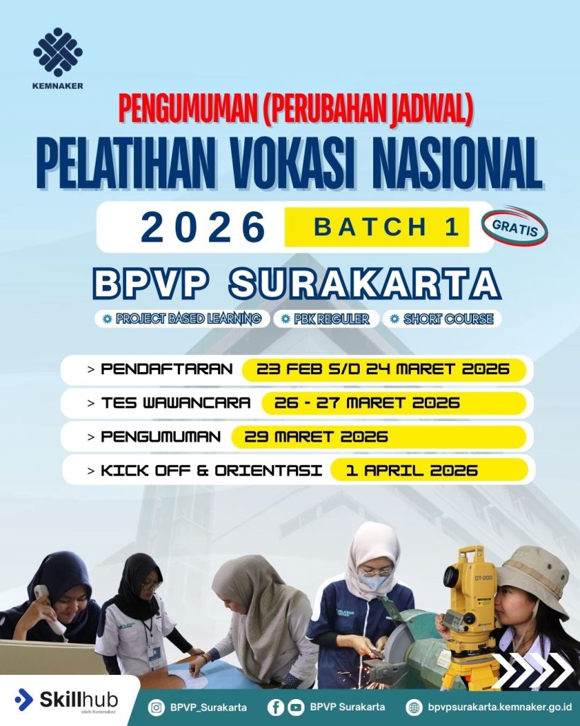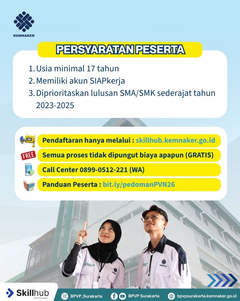 Jangan sampai kesempatan ini terlewat. Tingkatkan skill, perluas jaringan, dan raih masa depan karir yang lebih baik melalui Pelatihan Vokasi Nasional 2026.