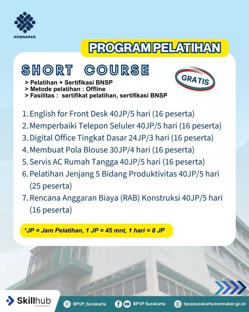 Jangan lewatkan kesempatan ini untuk belajar langsung dari instruktur berpengalaman, mendapatkan keterampilan praktis, serta memperluas peluang kerja di berbagai sektor industri.